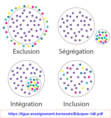 - L'inclusion : On vient de le voir: dans l'intégration c'est l'individu qui fait effort d'adaptation et d'adhésion à une dynamique sociale existant. L'inclusion suppose la transformation du systeme pour que chacun y trouve sa place ; ce n'est pas seulement l'individu qui s'adapte mais c'est la société ou l'institution qui s'ajuste à la diversité . L'inclusion suppose reconnaissance des différences, accessibilité, participation active et réelle , égalite et dignité .